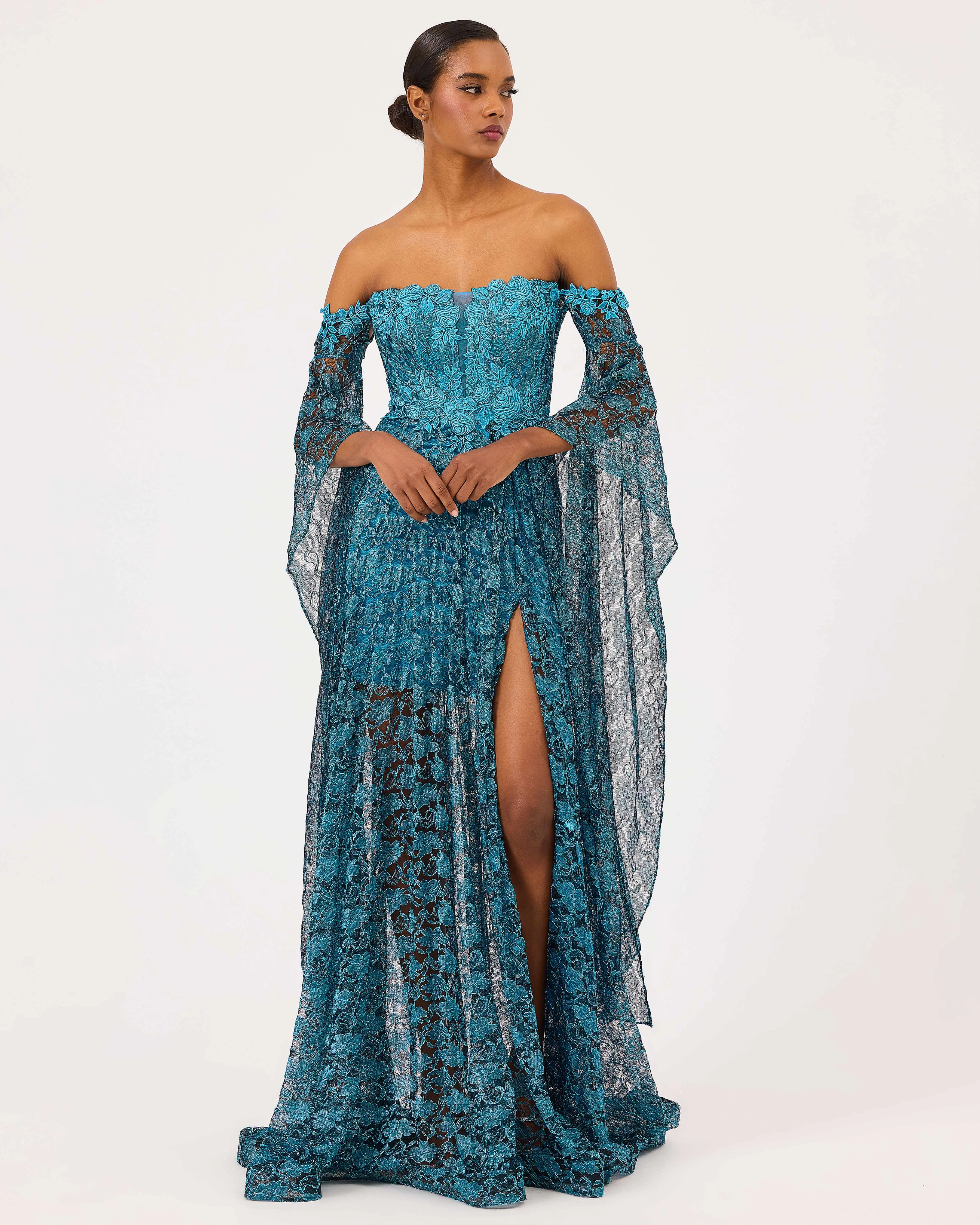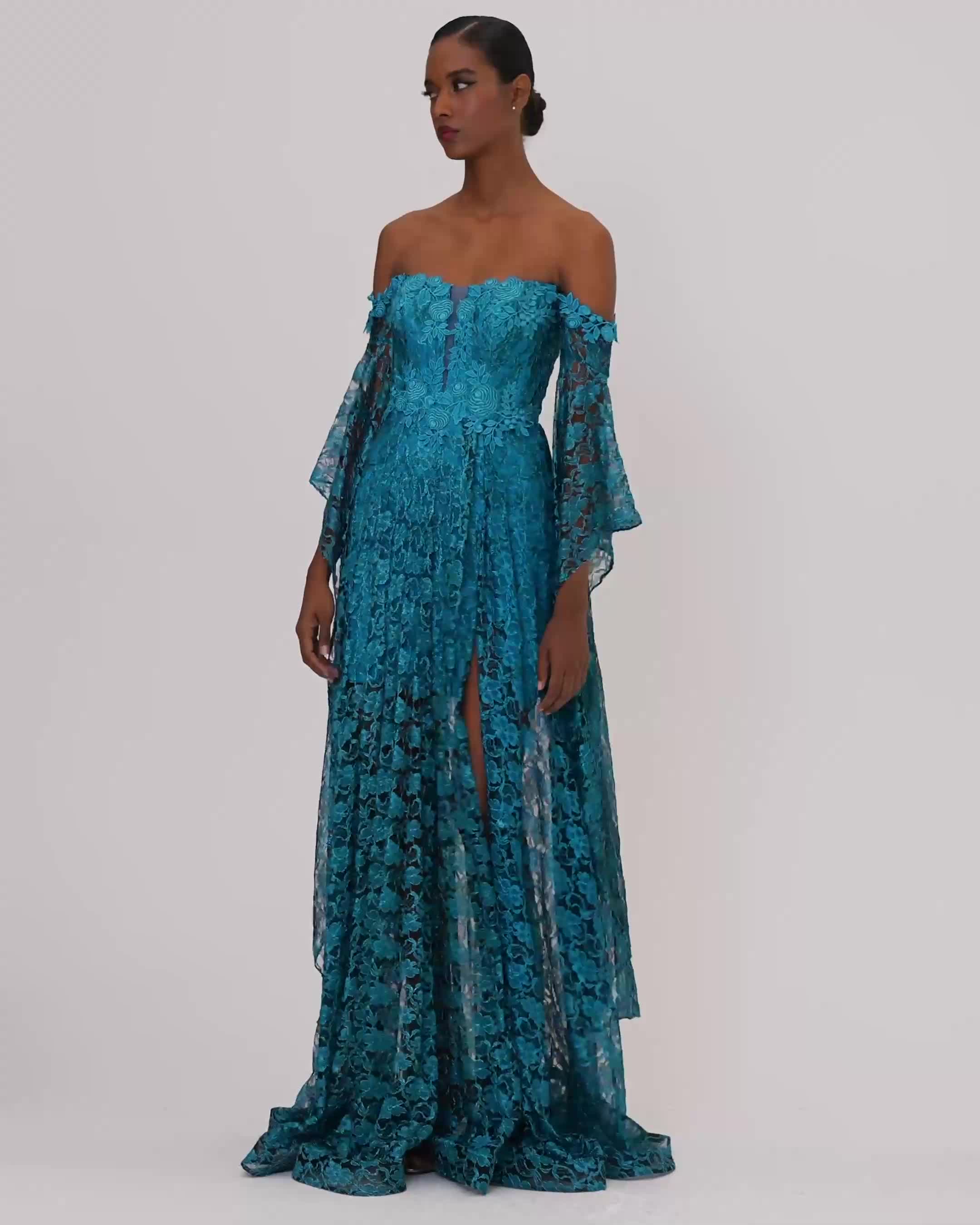 Straplez Uzun Kol Dantel Abiye