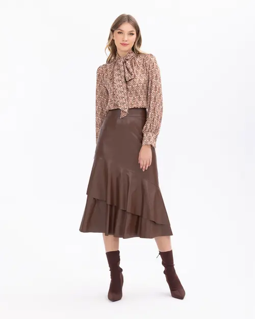 Volanlı Midi Boy Suni Deri Etek